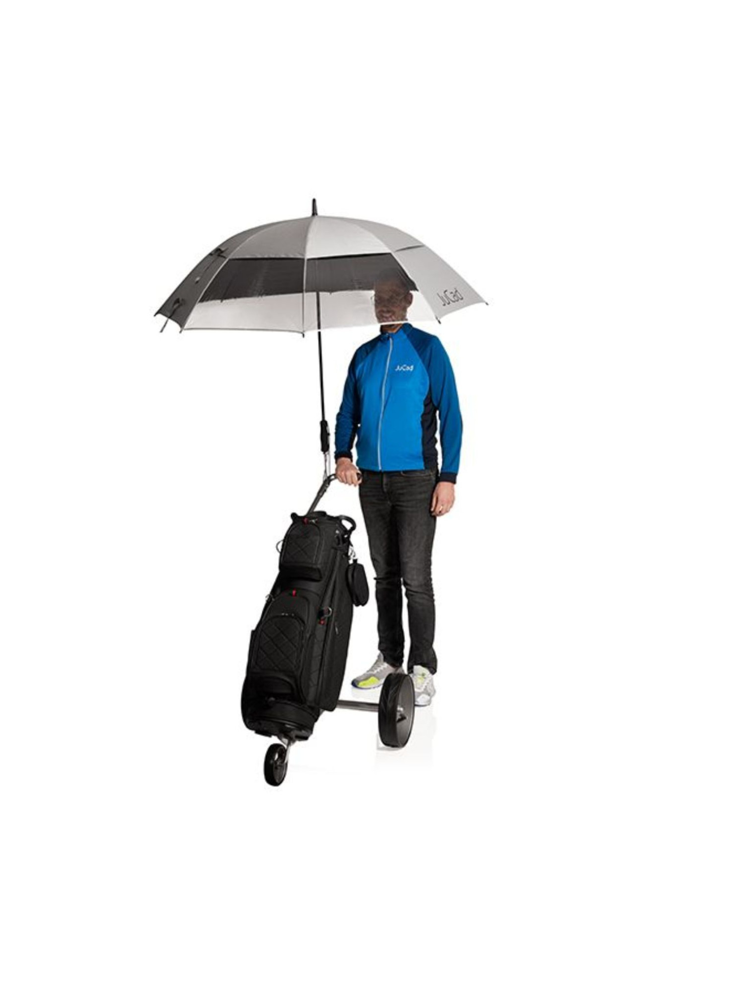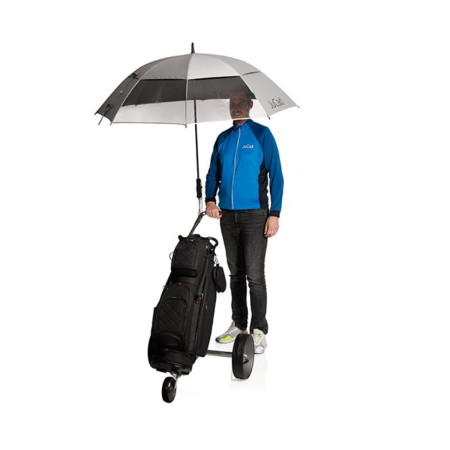Está equipado con una varilla que permite fijar el paraguas a su carrito JuCad. El mecanismo telescópico ofrece la posibilidad de alargar la varilla de forma continua hasta 15 cm, lo que permite a los golfistas de mayor estatura mantenerse erguidos y cómodos bajo el paraguas.
